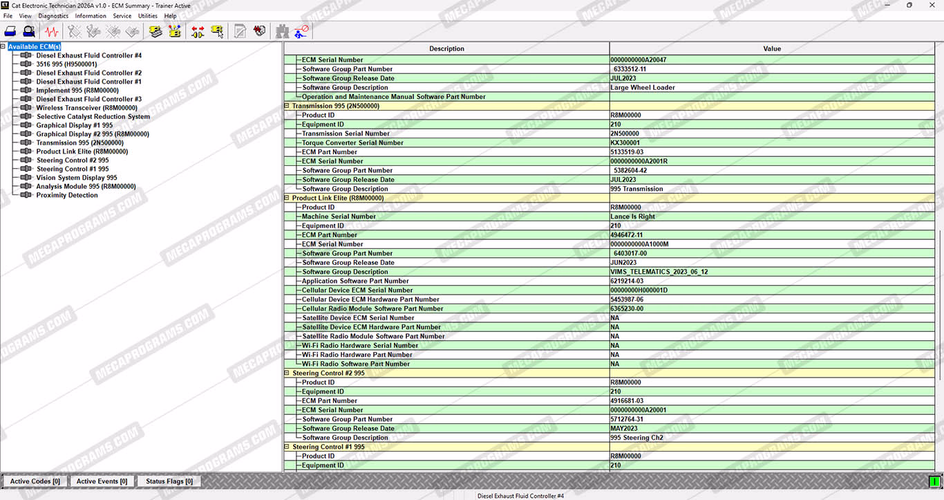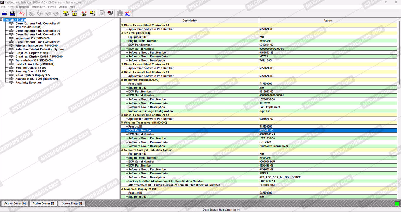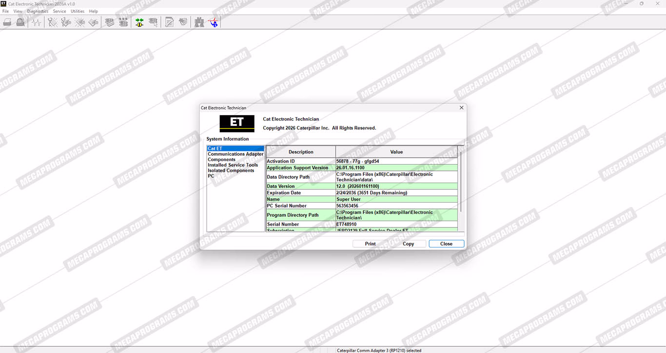 | Description | Caterpillar® Electronic Technician (CAT ET) is diagnostic software required to communicate, diagnose and service electronically controlled cat engines, and machines. When connected to an Electronic Control Module (ECM), a technician has the ability to diagnose existing and potential problems, configure and calibrate the product, and obtain data for analysis. Caterpillar Electronic Technician (CAT ET) is a diagnostic tool created by Caterpillar inc. That is used to diagnose and troubleshoot problems with Caterpillar-manufactured equipment and engines. It is compatible with a wide range of Caterpillar engines, from earlier heavy duty models to the latest advanced designs. Cat ET can be used to read engine performance parameters, diagnose engine faults, and configure engine settings. CAT ET can be used to perform maintenance and service tasks such as resetting engine parameters, programming injectors, and calibrating sensors. Additionally, the software includes an automatic Factory Password Keygen (FPKG) that will allow you to automatically modify those key parameters that request 10-digit security. Caterpillar electronic technician (cat et) is a diagnostic tool created by Caterpillar inc. |