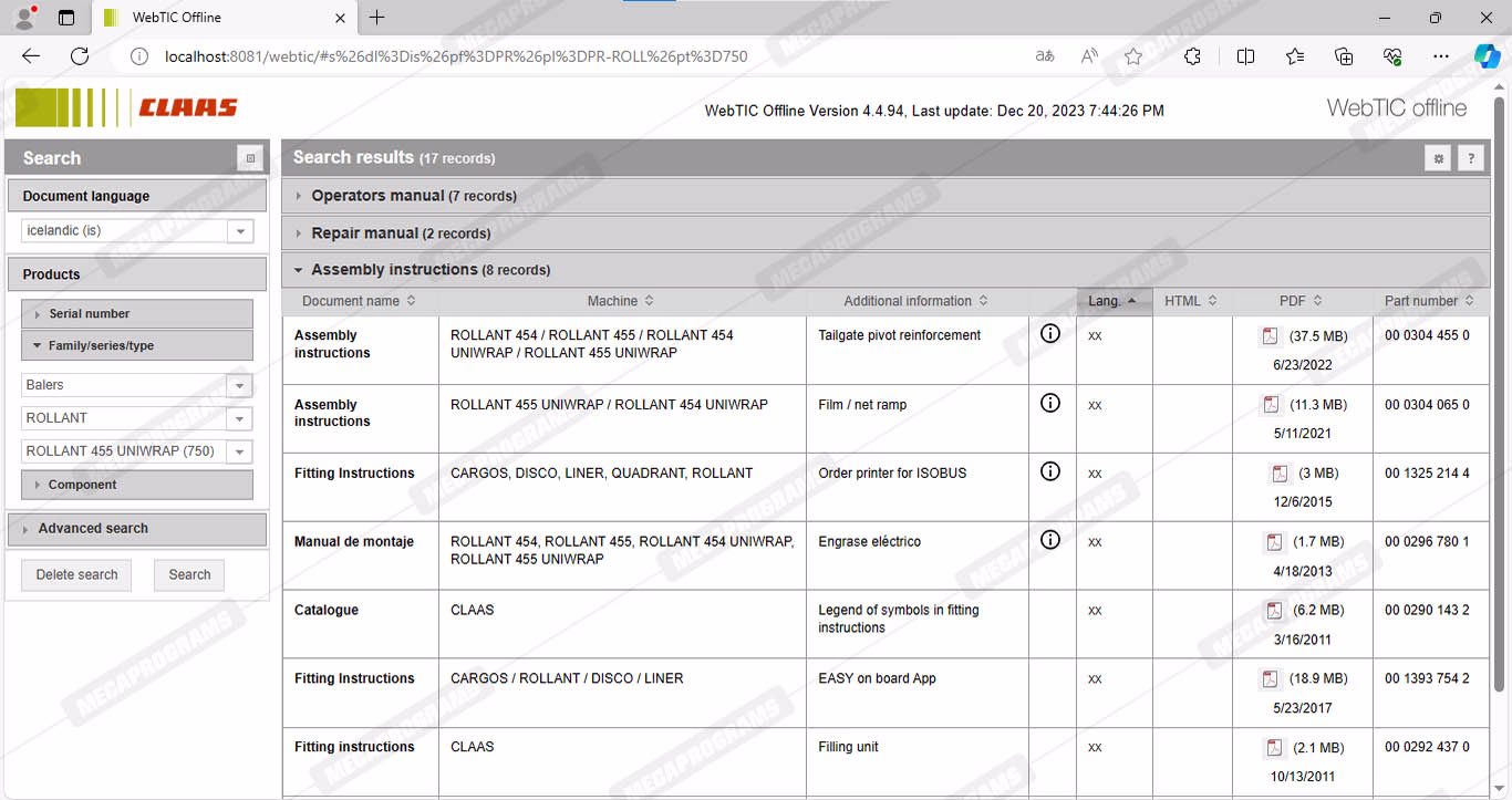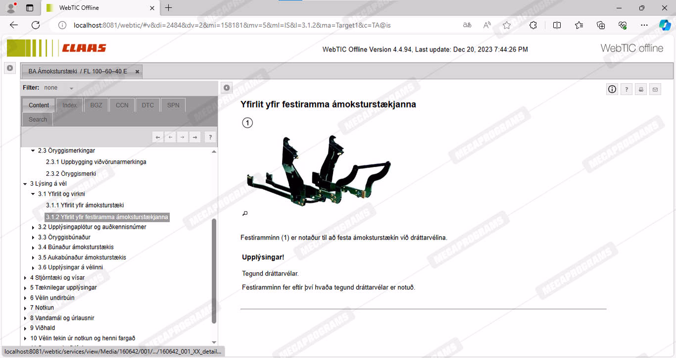| Description | Claas webtic offline contains repair and service information, operator manuals, repair manuals, service documentation for all models of claas agricultural equipment, including forage harvesters, combines, balers and tractors. |