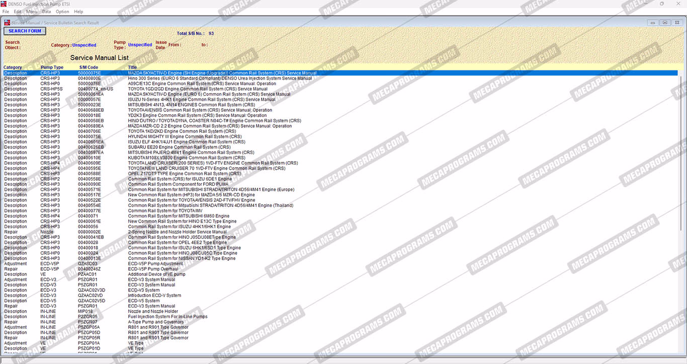 | Description | Denso parts catalog, manuals and test plans for different mechanical equipment. |