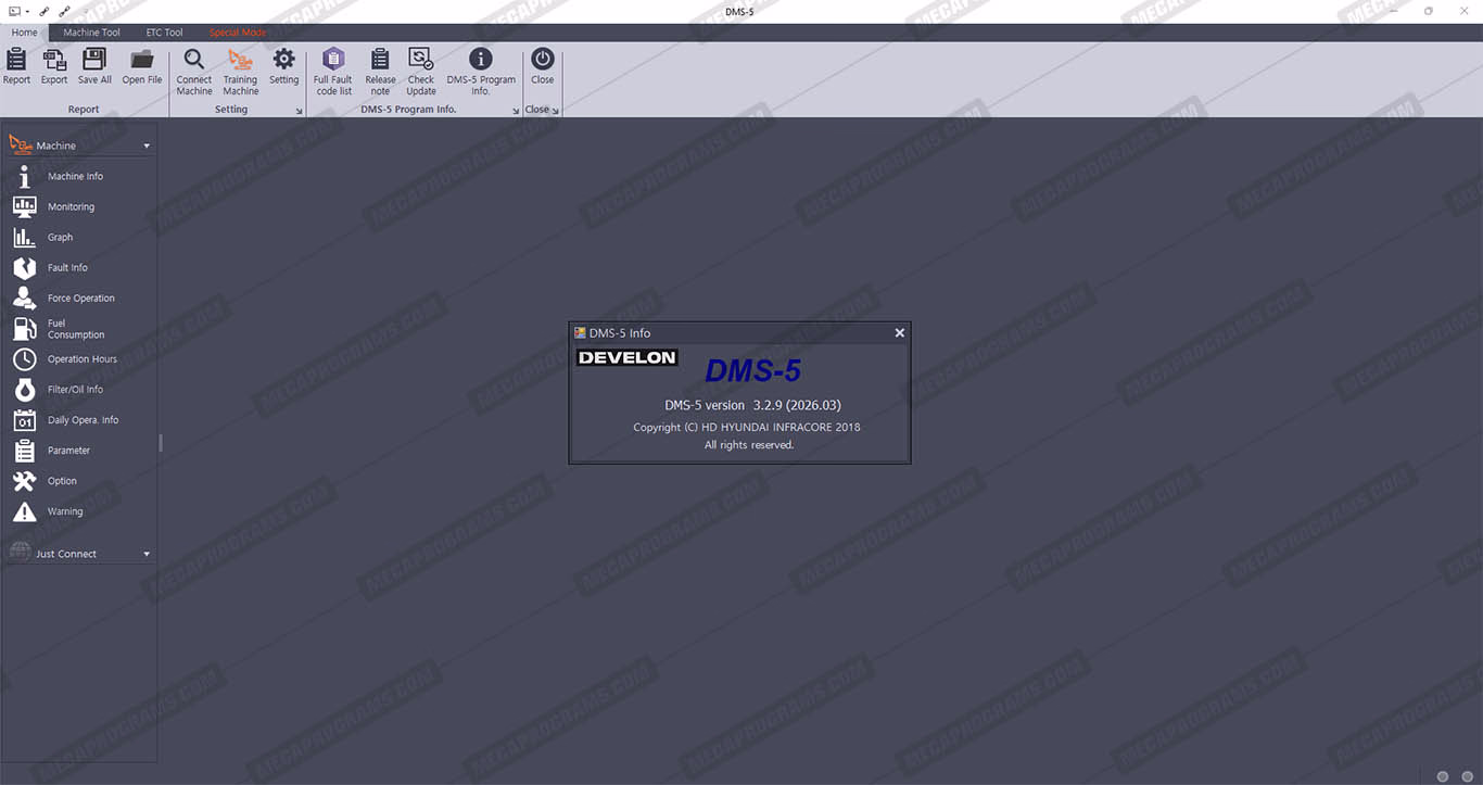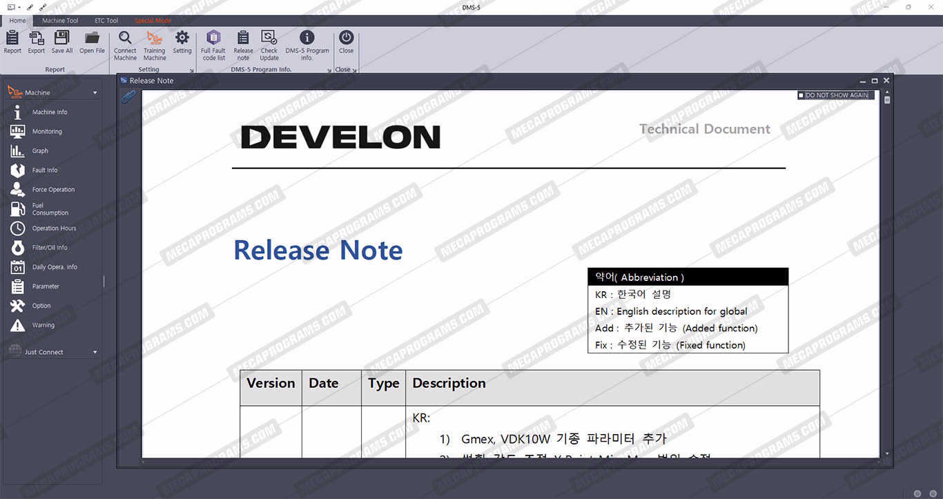 | Description | DEVELON DMS-5 IS DIAGNOSTIC SOFTWARE SPECIFICALLY FOR DOOSAN EXCAVATORS/WHEEL LOADERS. SOFTWARE COMMUNICATION WITH E-EPOS, ECU OR VCU AND PROVIDES POWERFUL FEATURES. |