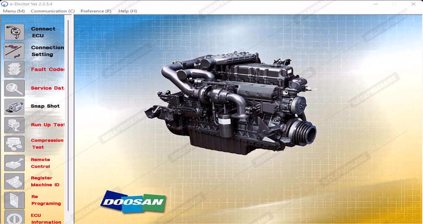 | Description | Doosan E-Doctor is a diagnostic software that shows the user the engine's fault status, history and manual troubleshooting: fault codes, engine history and manual troubleshooting. |