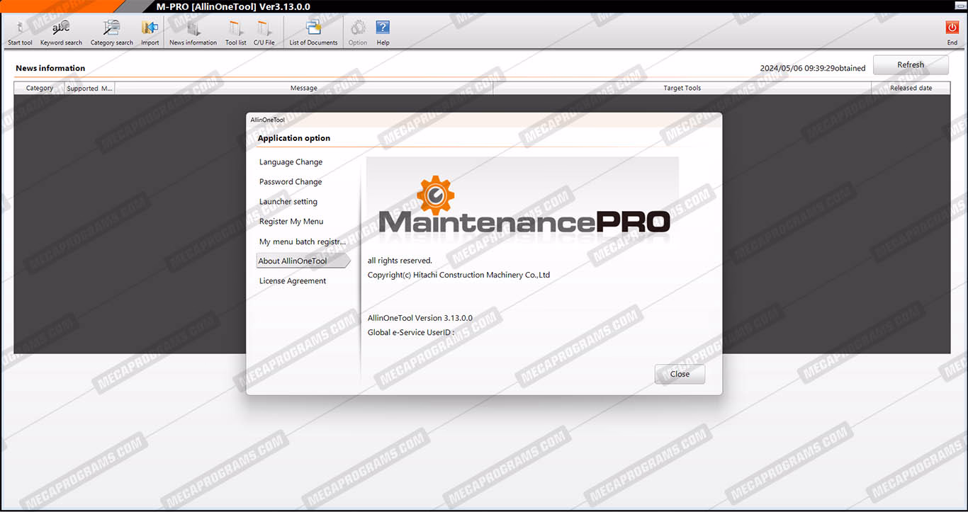 | Description | Hitachi Allinone Tool & MPDR is a diagnostic software for heavy machinery. Includes tools such as maintanance pro security/browsetool, MPDR & mpviewer main menu. |