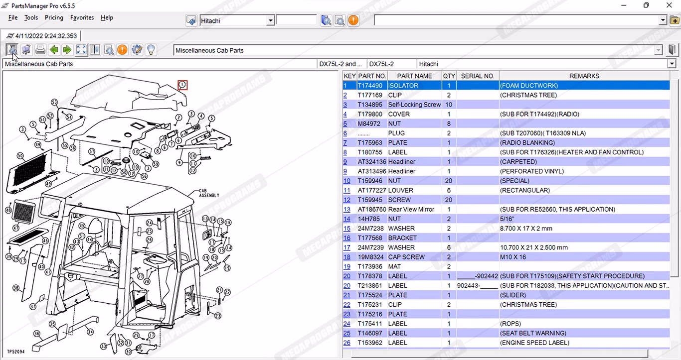 | Description | Hitachi parts manager pro is an electronic parts catalog for hitachi crawlers, excavators, forester equipment, loaders and trucks. |