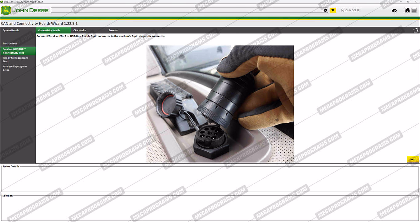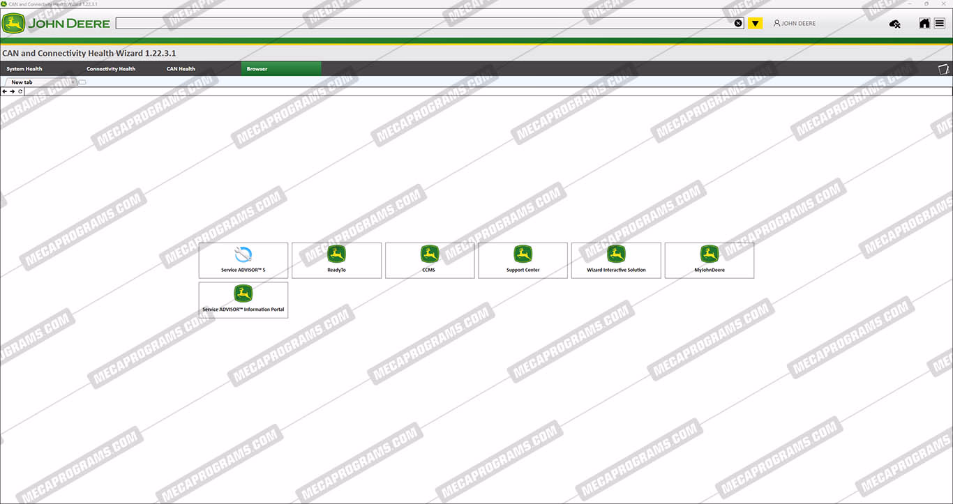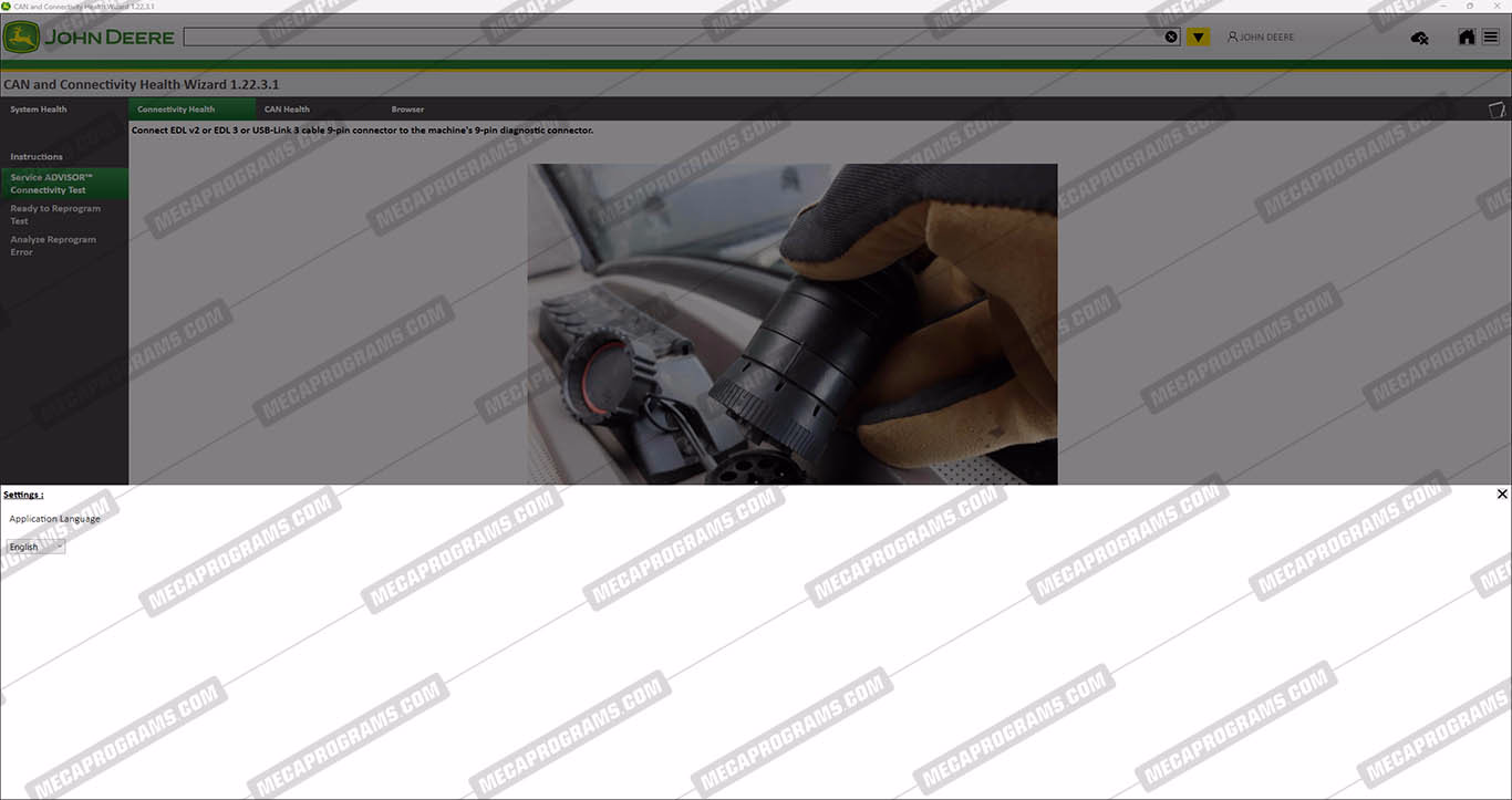 | Description | Can and connectivity health wizard is a program marketed by the software company John Deere diagnostic solutions. This software guide you throught the of the computer and communicate with the edl for service advisor diagnostic or reprogramming session. |
