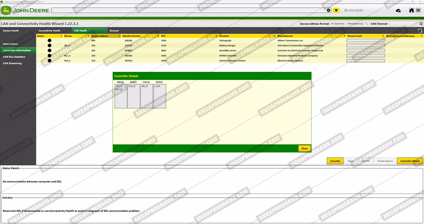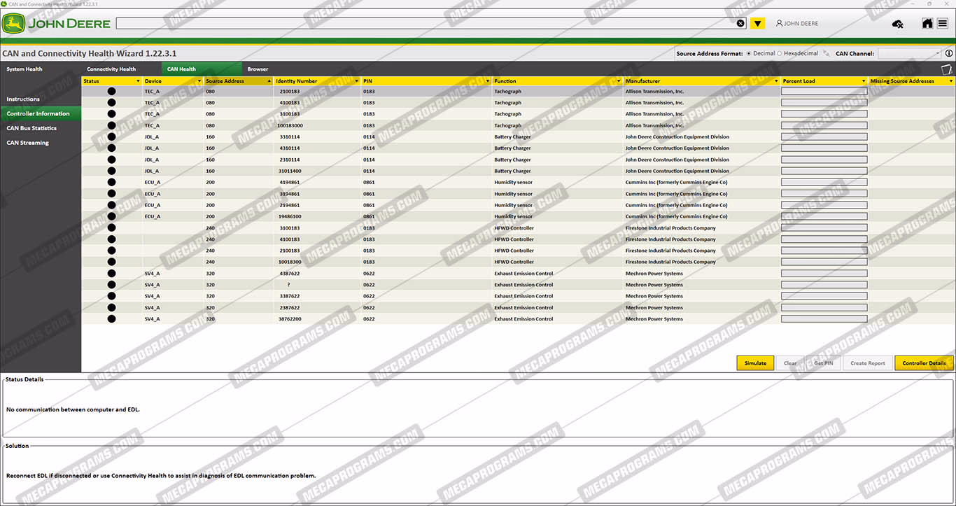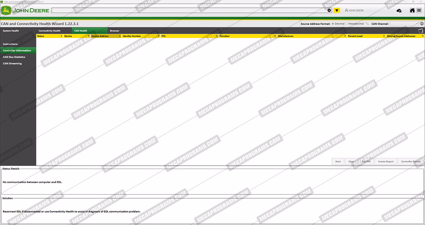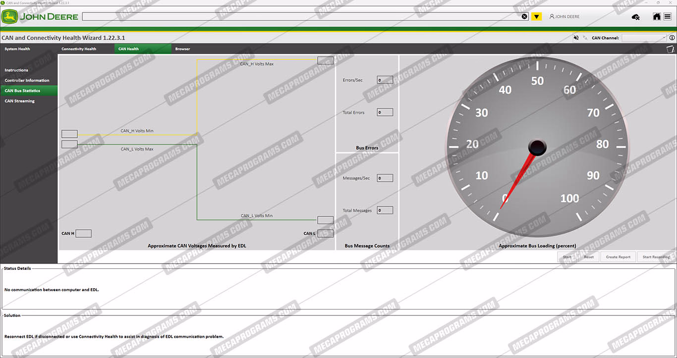 | Description | Can and connectivity health wizard is a program marketed by the software company John Deere diagnostic solutions. This software guide you throught the of the computer and communicate with the edl for service advisor diagnostic or reprogramming session. |