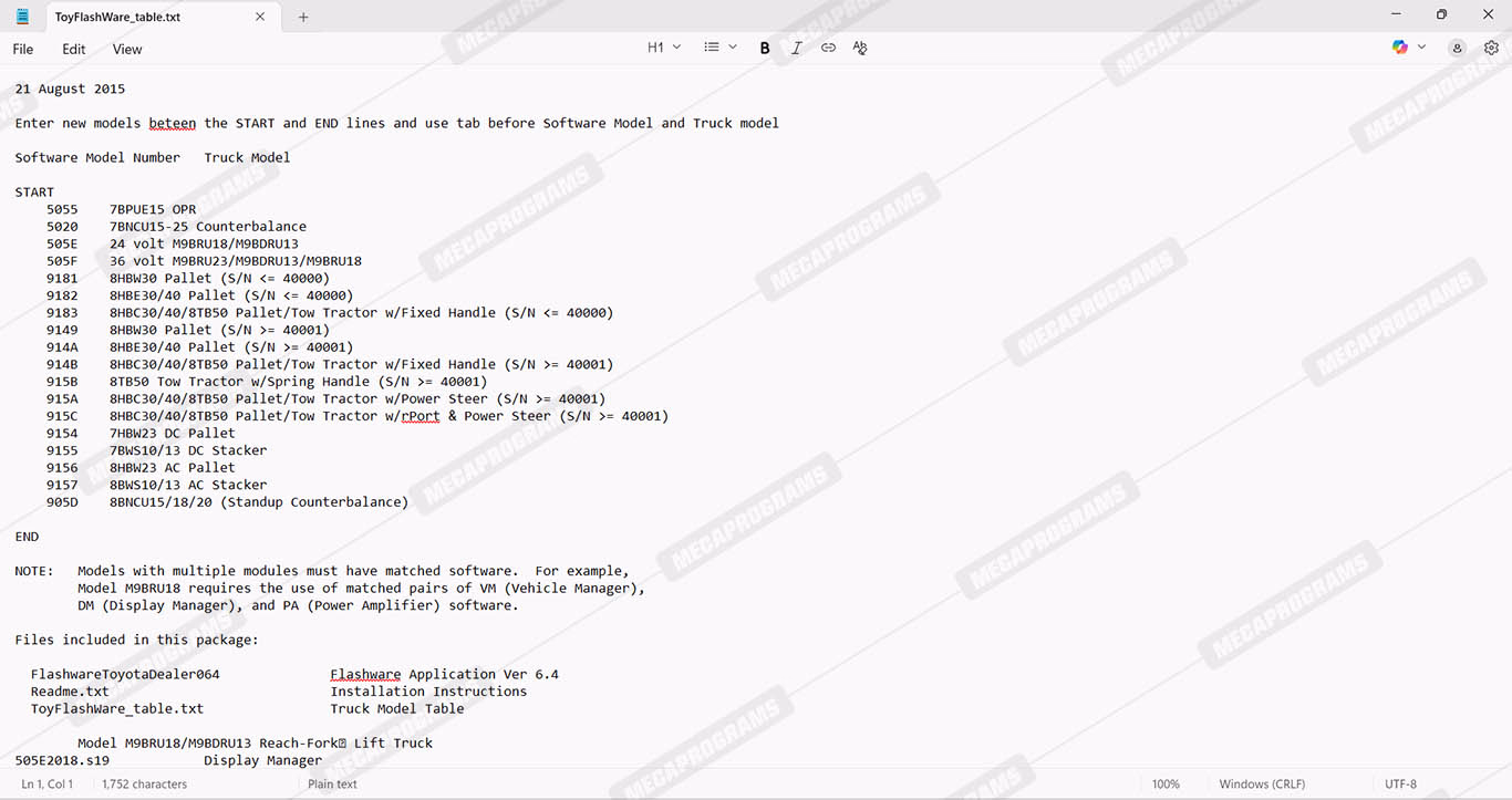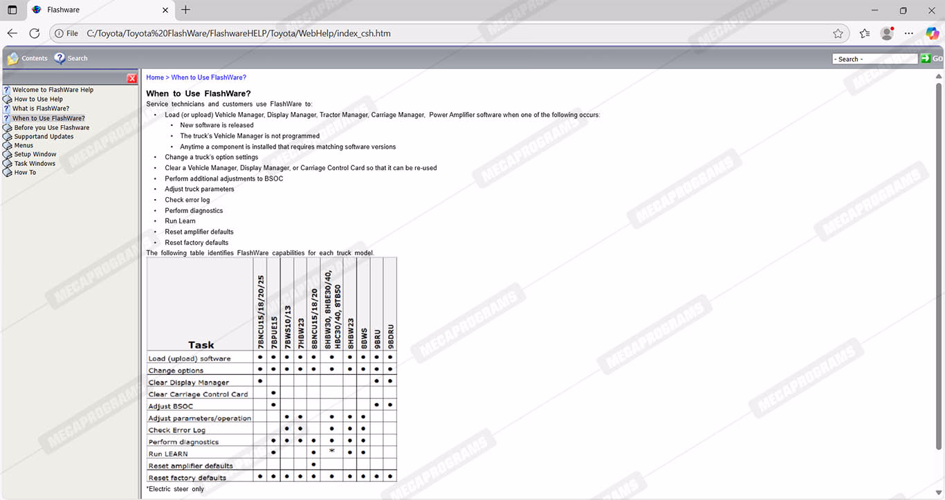 | Description | Toyota Flashware is a program that runs on a laptop computer. Flashware is used to install and update vehicle manager software, change configuration, run diagnostic procedures, and run calibrate. It is available on the Toyota Technical Information System (TIS) website on the dealer portal. |