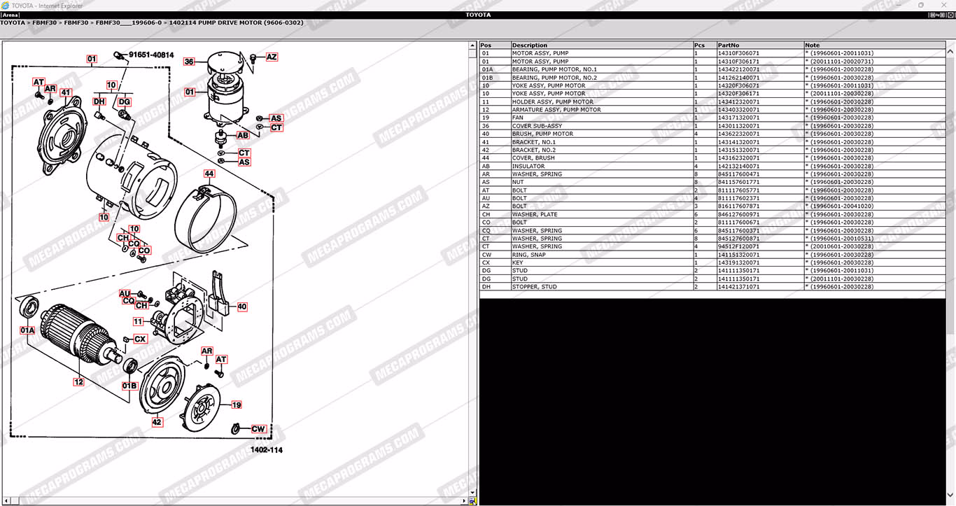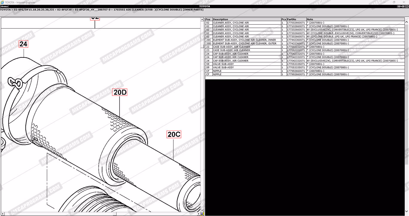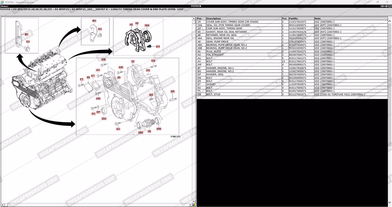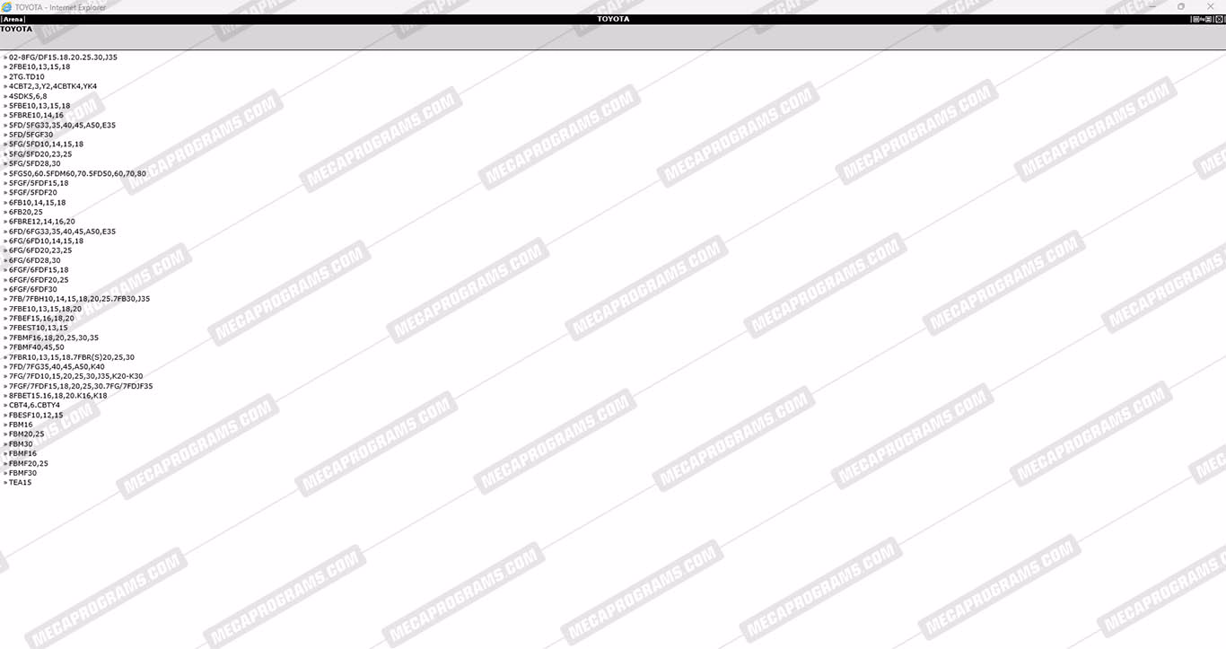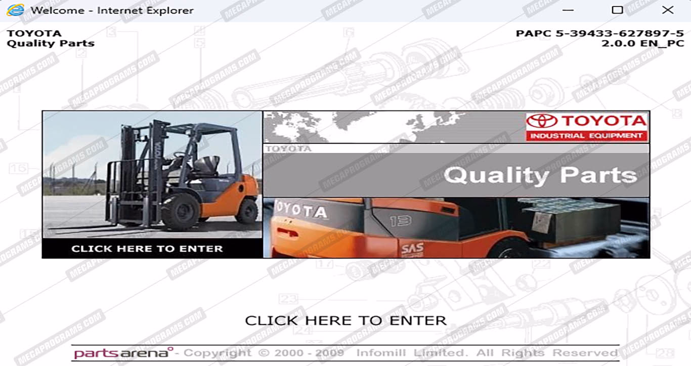 | Description | Toyota Forklift Quality Parts Arena is a comprehensive program that features a detailed catalog of electronic system components, spare parts, and original accessories for Toyota Forklifts. It also provides special service instructions, operational guidelines, assembly instructions, and additional information for all types of Toyota forklifts. |
